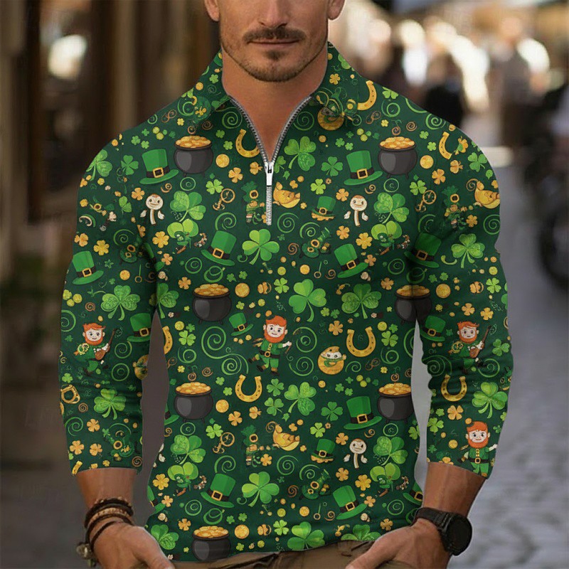 Men's Polo Polo Shirts Daily Saint Patrick Day Lapel Long Sleeve Fashion Hawaiian Graphic Four Leaf Clover Printing Quarter Zip Spring Fall Regular Fit Forest Green Spring Grass Green Dark Green