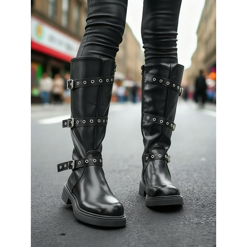 Women's Punk Knee High Riding Boots - Faux Leather Buckle Strap Gothic Boots with Rivets for Halloween, Festivals and Streetwear Style