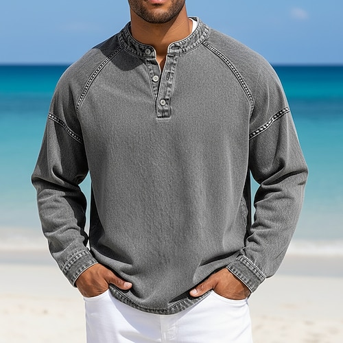 Per uomo Maglietta Maglia Henley Camicia 100% cotone lavaggio acido Manica Lunga Collo alla coreana Henley Estate Primavera Autunno Semplice Vintage Streetwear Casual Lavato Manica corta Casuale Casa