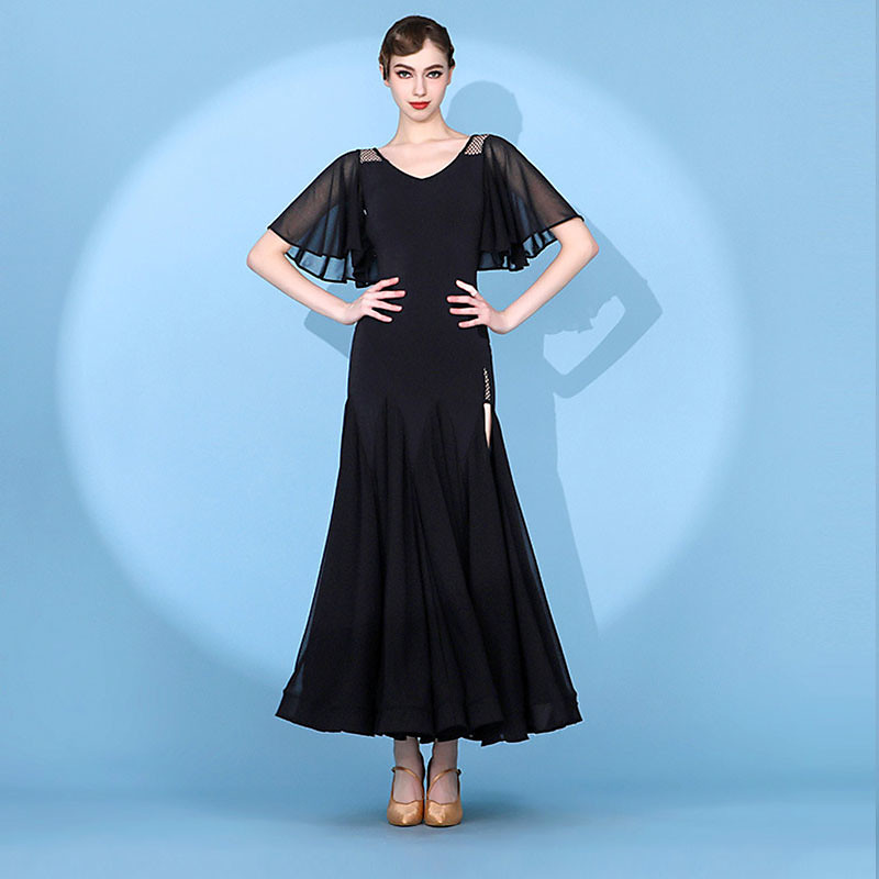 Women's Ballroom Dance Dress V-Neck Butterfly Sleeve Waltz Gown High Slit Mesh Modern Standard Competition Dancewear White