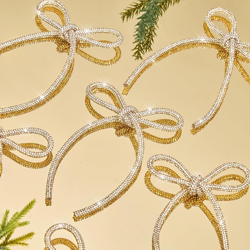 6PCS Christmas bow decoration champagne gold sparkling rhinestone bow with metal wire tie decoration suitable for Christmas tree decoration flower garlands gift packaging