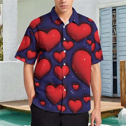 Valentinstag-Herz, lässiges Herrenhemd, Alltagskleidung, Ausgehen, Wochenende, Sommer, Turndown, kurze Ärmel, Rot, Marineblau, Khaki, S, M, L, 4-Wege-Stretch-Stoffhemd