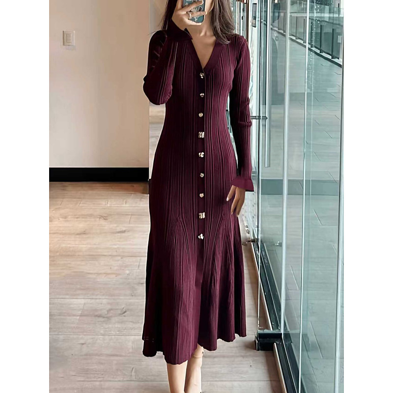 Women's Midi Dress Sweater Dress Sheath Dress Casual Daily Slim Plain Long Sleeve V Neck Black Fuchsia Spring Fall Winter