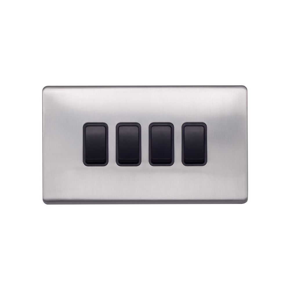 Lieber Brushed Chrome 10A 4 Gang 2 Way Switch - Black Insert Screwless - Size: 146mm x 86mm x 2 mm