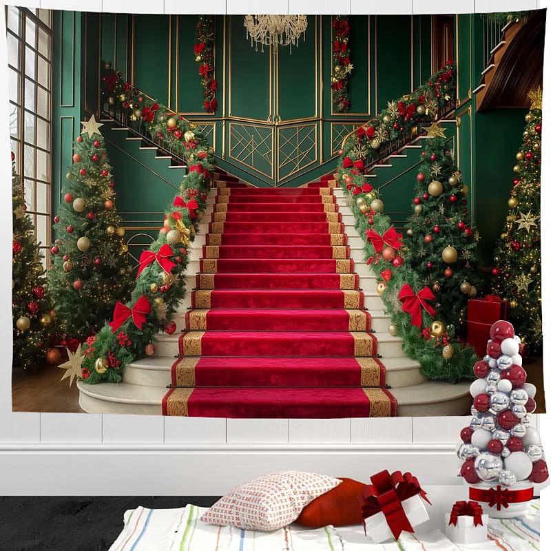 Christmas Staircase Tapestry – Festive Holiday Wall Hanging with Christmas Tree Lights and Garland Pattern, Winter Home Living Room Decoration