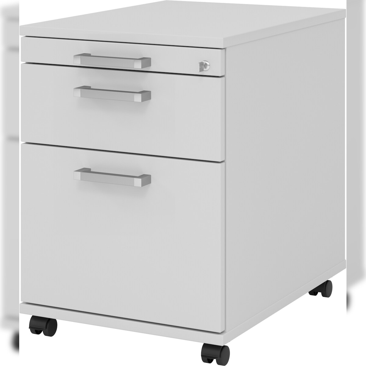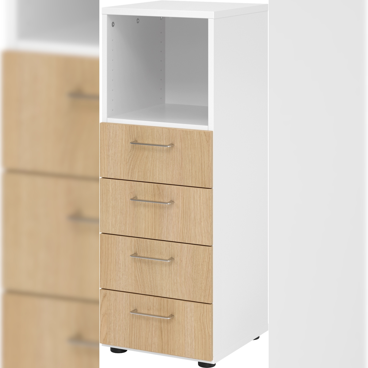 bümö smart Schubladenschrank, Büroschrank in Weiß/Eiche mit 4 Schüben & 1 Regalfach - Bürocontainer aus Holz, Container mit Metallgriffen & Soft-Stop