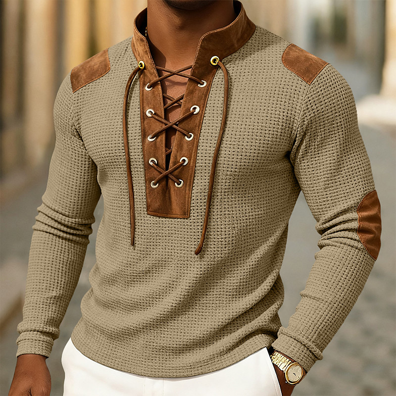 Men's Waffle Shirt T Shirt Tee Top Shirts With Elbow Patches Long Sleeve Collar Spring Spring Fall Color Block Vintage Designer Basic Lace up Patchwork Casual Vacation Street Blue Black khaki Top