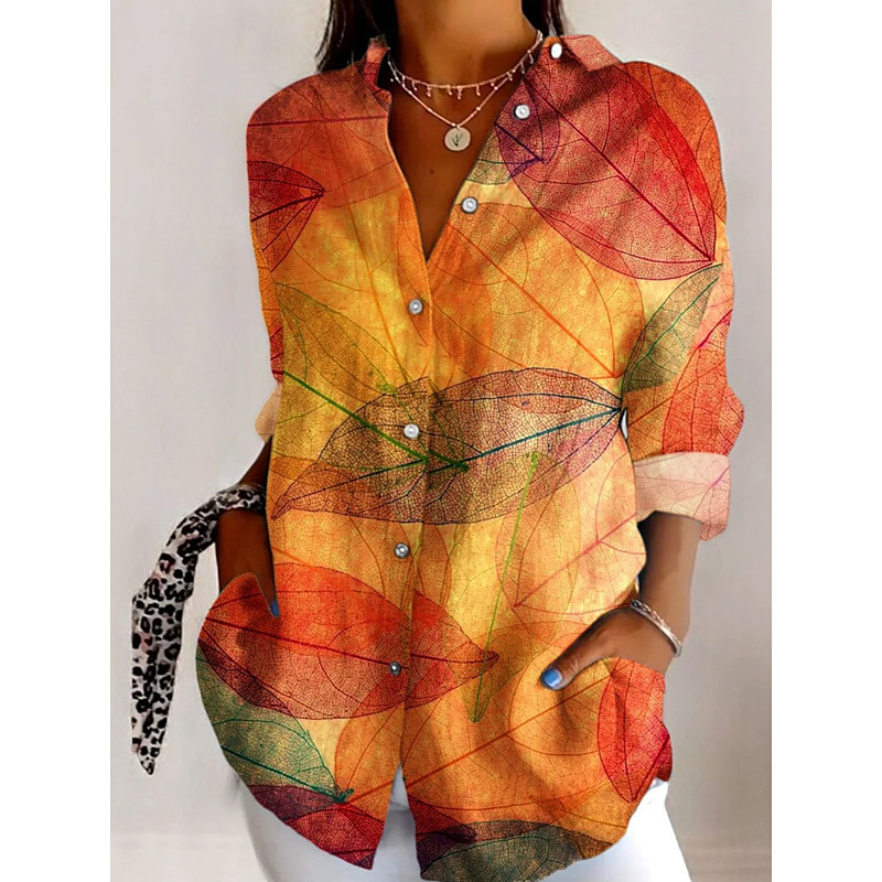 Women's Shirt Button Down Tunic Shirt Collar Long Sleeve Graphic Leaves Elegant Vintage Tropical Regular Tops Work Daily s Print Pink Orange Green Spring Fall