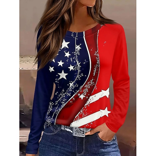 Maglietta Patriottica per il Giorno dell'Indipendenza Maglietta da Donna Grafica Bandiera Moda Elegante Classica Maniche Lunghe Collo Tondo Top Regolari Quotidiano Weekend Stampa Blu Bianco Rosso