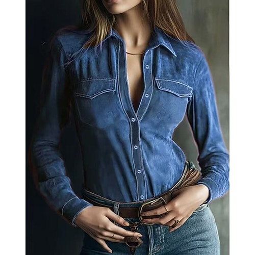 Per donna Blusa Top Eleganti Tinta unica Semplice Elegante Vintage Western Manica Lunga Colletto a Camicia Top Regolari Quotidiano Lavoro Ferie Arricciato Patchwork Bottoni Blu Nero Vino Marrone