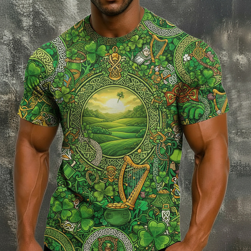 St. Patrick's Day Short Sleeve T-Shirt for Men Ireland Leprechaun Lucky Irish Shamrock Graphic Tee 3D Print Crew Neck St. Paddy's Day Top