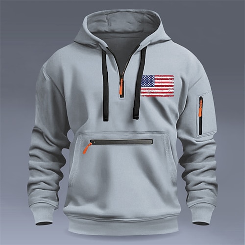 Men's Hoodie Pullover Quarter Zip Hoodie Blue Black Wine Navy Blue Camel Hooded American US Flag Pocket Print Daily Sports Outdoor Holiday Streetwear Sportswear Casual Fall Winter Clothing Apparel