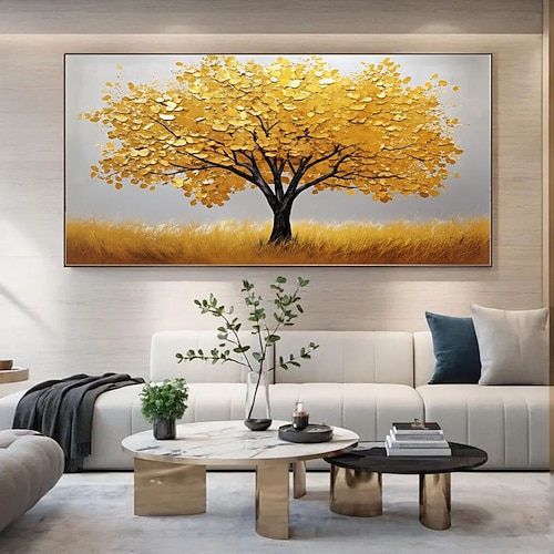 Grande albero dorato 3d dipinto a olio su tela fatto a mano autunno natura paesaggio dipinto a mano arte da parete pittura botanica coltello luce di lusso per l'arredamento del soggiorno