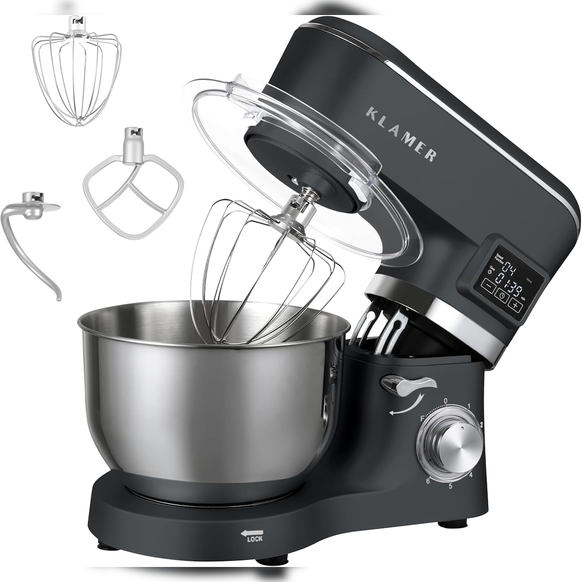 KLAMER Küchenmaschine Classic 1400 W – 5,5 L Rührschüssel aus Edelstahl, Knet-, Rühr- & Schneebesenaufsatz, Timer & LED-Display, stabile Saugnapffüße…