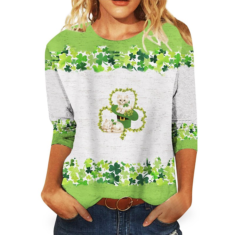 St. Paddy's Day St. Patrick's Day Women's T Shirt Leaf St. Patrick's Day Long Sleeve Round Neck Regular Tops Holiday Weekend Print Grass Green White Light Green Army Green Green