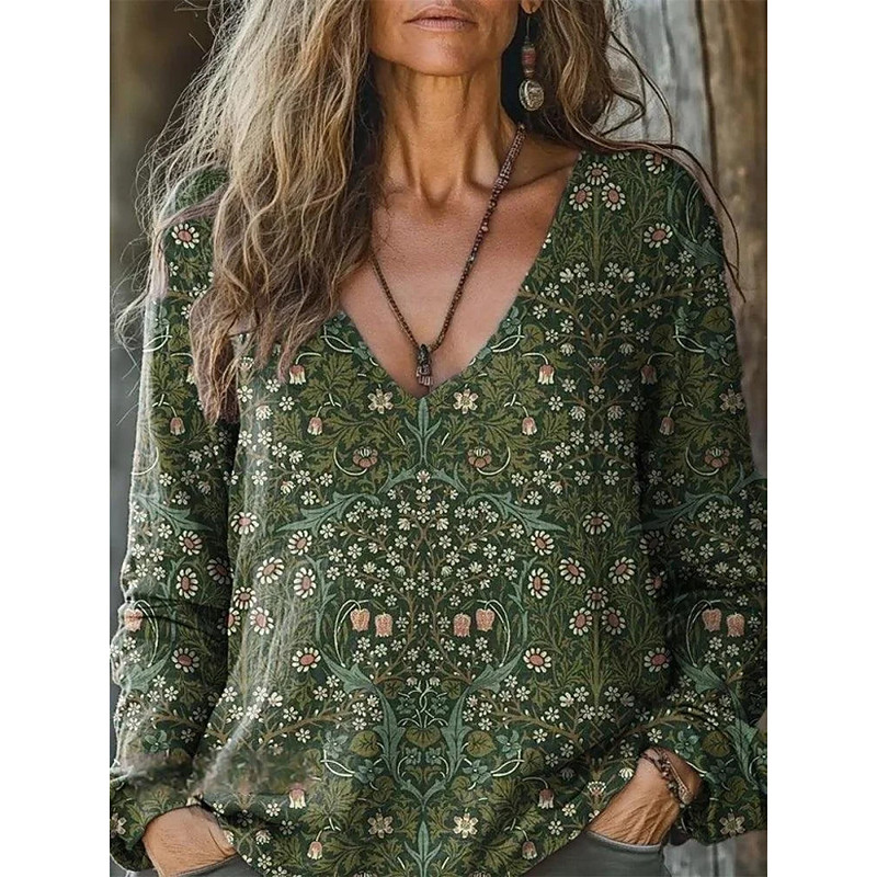 Women's Blouse Floral Bohemia Vintage Long Sleeve V Neck Regular Tops Daily Holiday Print Grass Green Light Green Wine Army Green Red Summer Spring Fall