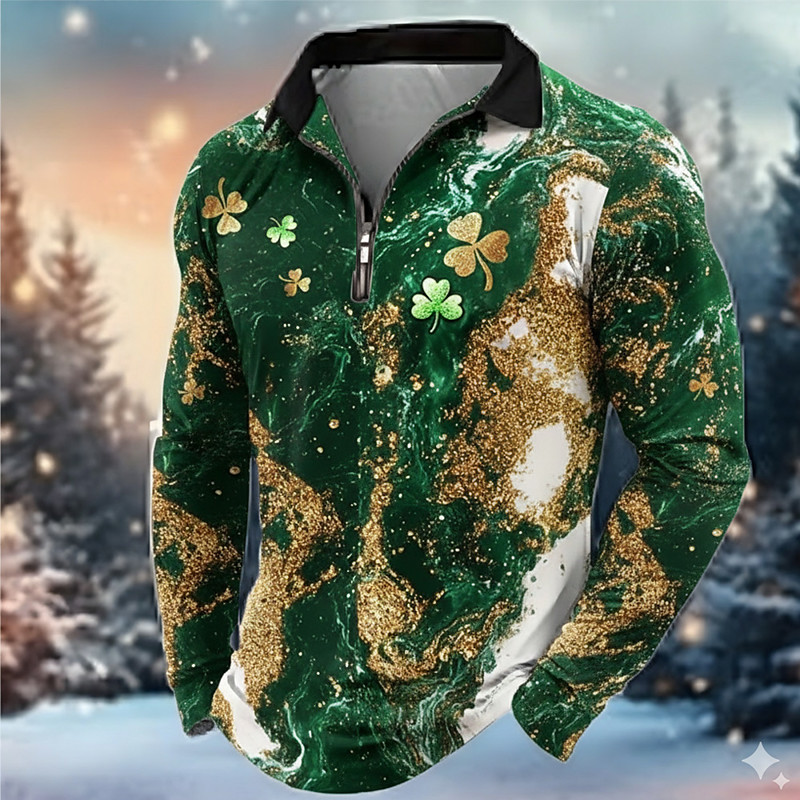 St Patrick's Day Men's Shamrock Marble Polo Long Sleeve Turndown Modern Leisure Holiday Casual Daily Festival Zipper 3D Print Spring Fall Green 1# Green 2# Green 3#