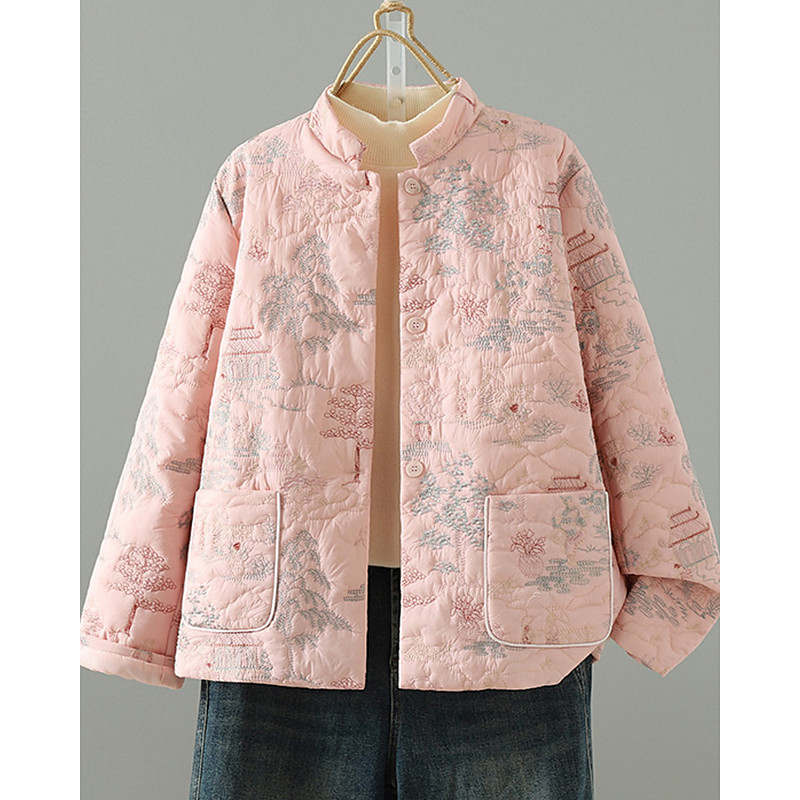 Women's Winter Coat Parka Warm Comfortable Pocket Fashion Casual Floral Vacation Casual Daily Wear Going out Regular Stand Collar Regular Fit Long Sleeve Outerwear White Light Green Pink Fall Winter