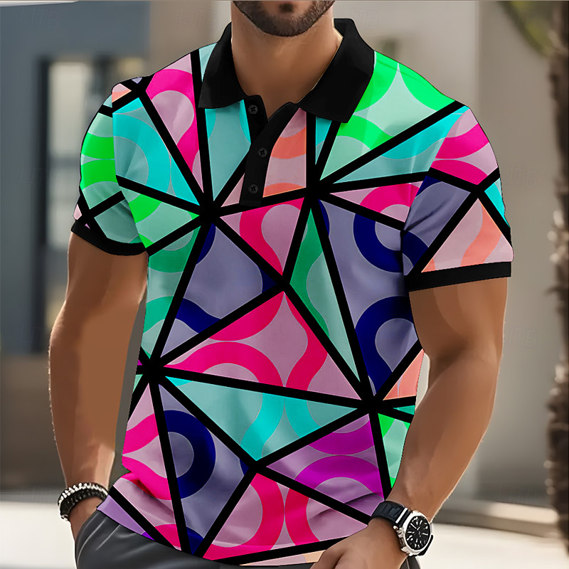 Men's Abstract Geometic Polo Short Sleeve Polo Shirts Lapel Casual Business Athleisure 3D Print Buttons Summer Blue Purple Green
