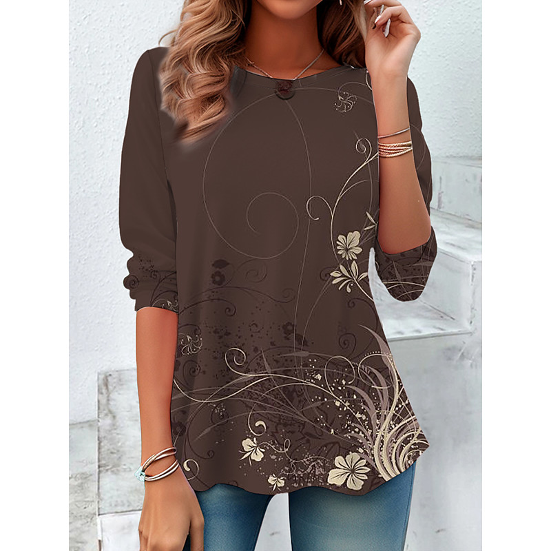 Women's T shirt Crew Neck Long Sleeve Tunic Floral Graphic Casual Regular Tops Daily Print Light Brown Spring Fall