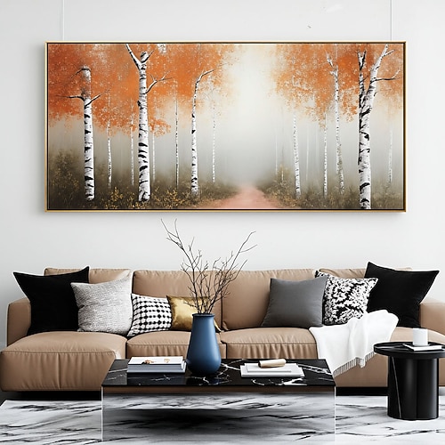 Abstrakte Herbstlandschaft mit rotem Baum, Leinwandbild mit Birkenwald, Wanddekoration fürs Wohnzimmer