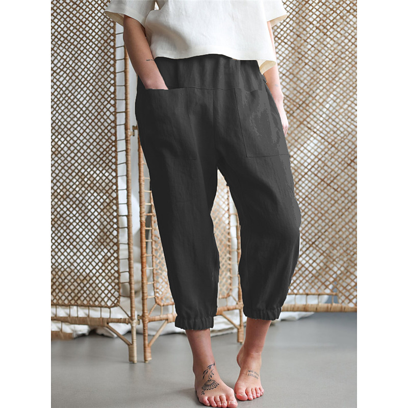 Women's Cotton Linen Pants Comfort Pure Color Pocket Elastic Waist Breathable Micro-elastic Home Black White Khaki Summer