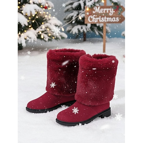 stivali invernali da donna in pelliccia sintetica color bordeaux a metà polpaccio: caldi stivali da neve in stile Babbo Natale per Natale, outfit per le feste e abbigliamento outdoor