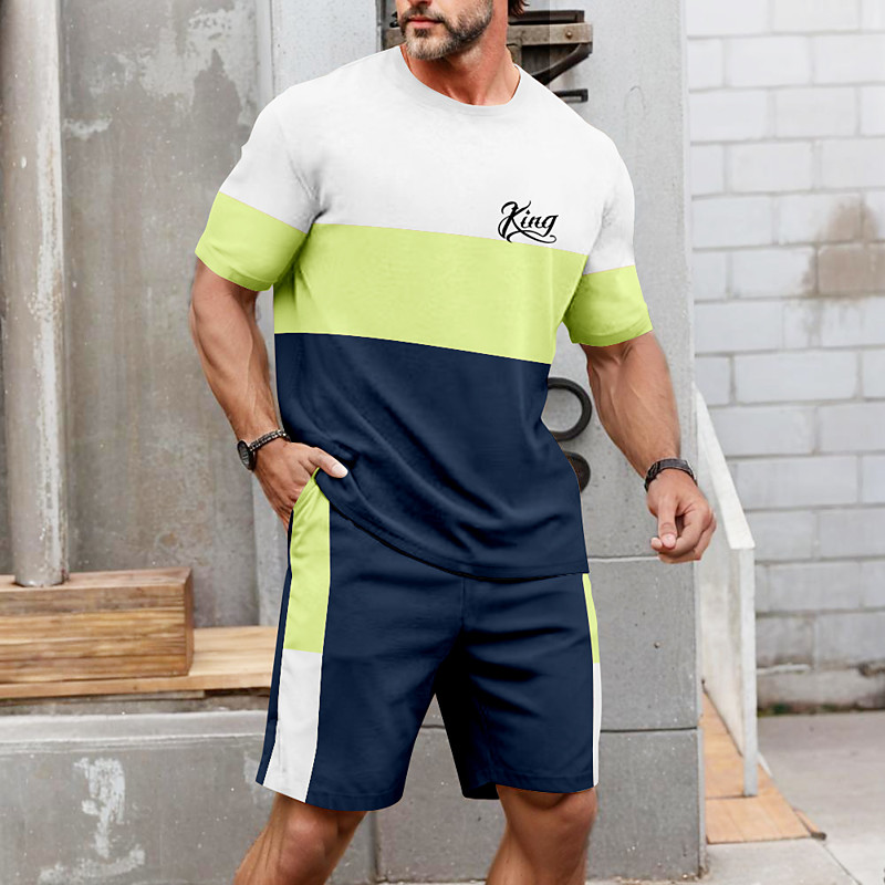Men's Horizontal Stripes 2pcs Tees sets Summer Tops Short Sleeve Short Pants Crew Neck Sport Casual Outdoor Vacation Sport 3D Print Summer Pink Brown Green