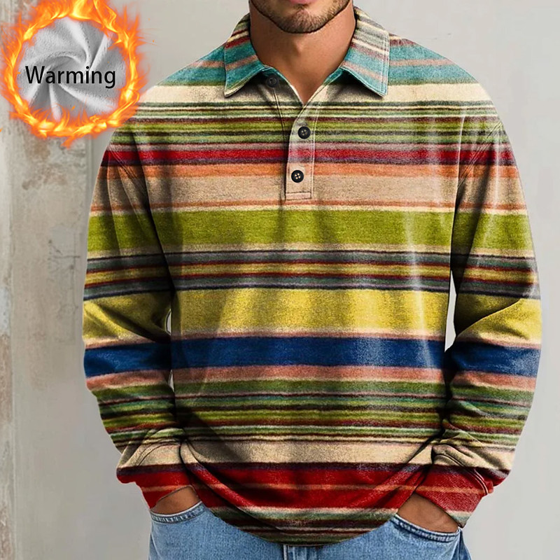 Men's Stripes Abstract Polo Shirts Themmal Shirts Long Sleeve Polo Shirts Lapel Casual Athleisure Holiday Daily Wear 3D Print Fall Winter Red Brown Rainbow