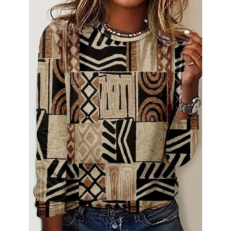 Women's T Shirt Graphic Geometric Vintage Fashion Stylish Long Sleeve Crew Neck Regular Tops Daily Weekend Print Pink Blue Brown Khaki Summer Spring Fall