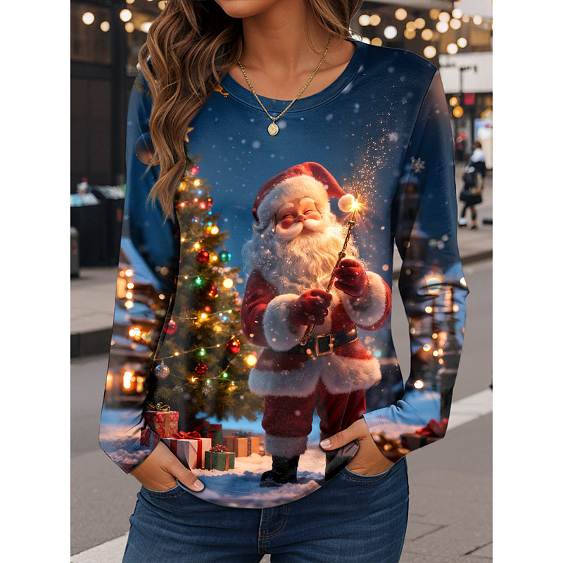 Christmas Women's T Shirt Graphic Claus Vintage Fashion Stylish Long Sleeve Crew Neck Regular Tops Daily Weekend Print Red Blue Dusty Blue Fall Winter