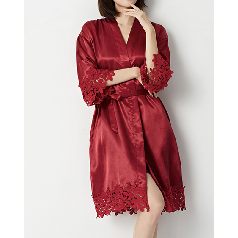 Women's Robe Casual Soft Satin Pure Color Lace up Daily Home Bed Long Sleeve V Neck Black White Champagne Pink Wine Summer Spring Regular Fit Loose Fit