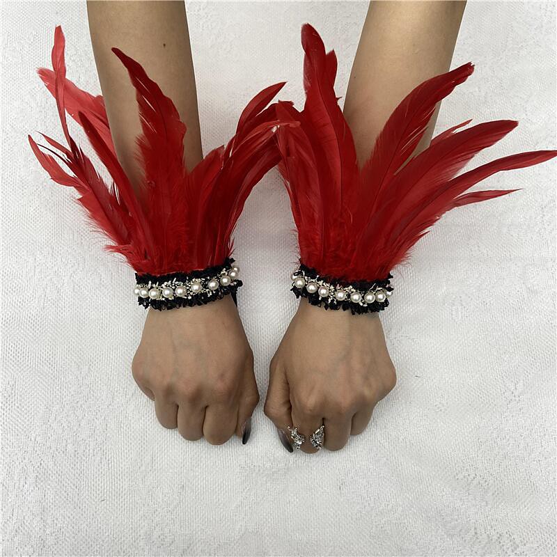 Carnival 2026Rio Carnival Samba Accessories Women's Black Feather Wrist Cuffs with Pearl Lace, 1 Pair Natural Feather Wristband Bracelets Brazil Festival Performance Costume