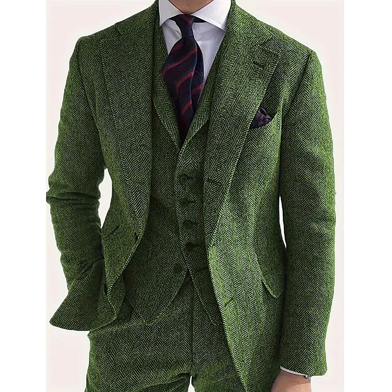 Men's Wedding Business Tweed Suits Notch Lapel Green Formal Herringbone Tailored Fit 3 Piece Single Breasted One-button