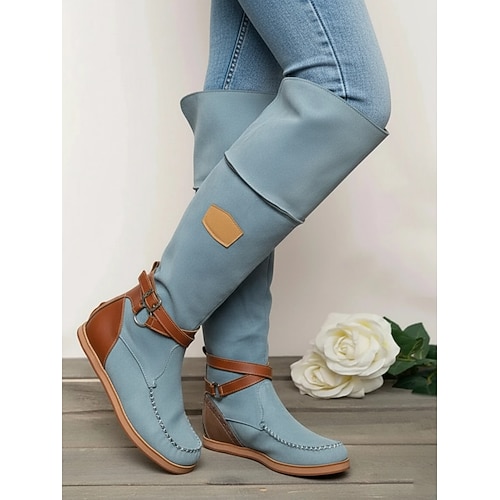 stivali da donna in pelle scamosciata alti fino al ginocchio con tacco a zeppa e cinturino con fibbia - stivali casual in stile bohémien in denim blu