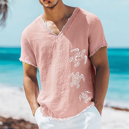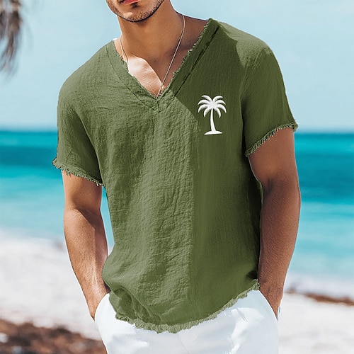 Herren-T-Shirt mit Palmenprint aus Leinen-Baumwoll-Mischgewebe, V-Ausschnitt, offene Kanten, altrosa, sommerliches Strandurlaubs-Shirt mit Fransen, weiches Designer-Top, Größen S-3XL