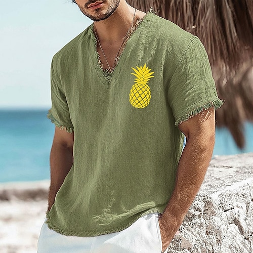 Herren-T-Shirt mit Ananas-Print aus Leinen-Baumwoll-Mischgewebe, V-Ausschnitt, offene Kanten, olivgrün, sommerliches tropisches Strandurlaubs-Shirt, ausgefranstes, weiches Modetop, Größen S-3XL