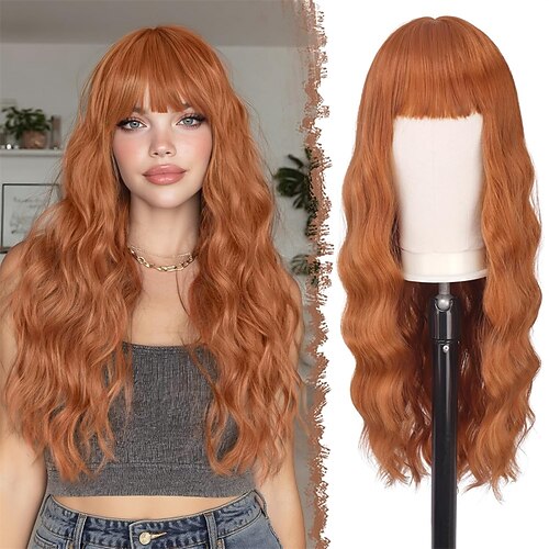 blonde Damenperücken gewellter Mittelteil Perücke mit Pony lange gewellte hitzebeständige Kunsthaarperücken