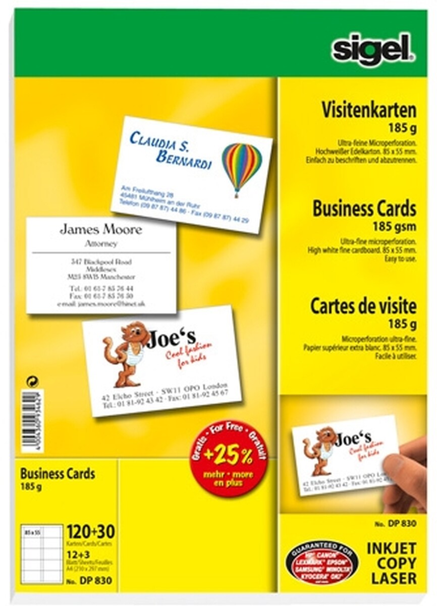 Sigel Visitenkarten MP A4 Ink/Laser/Copy 185g/qm hochweiß VE=600 Stück