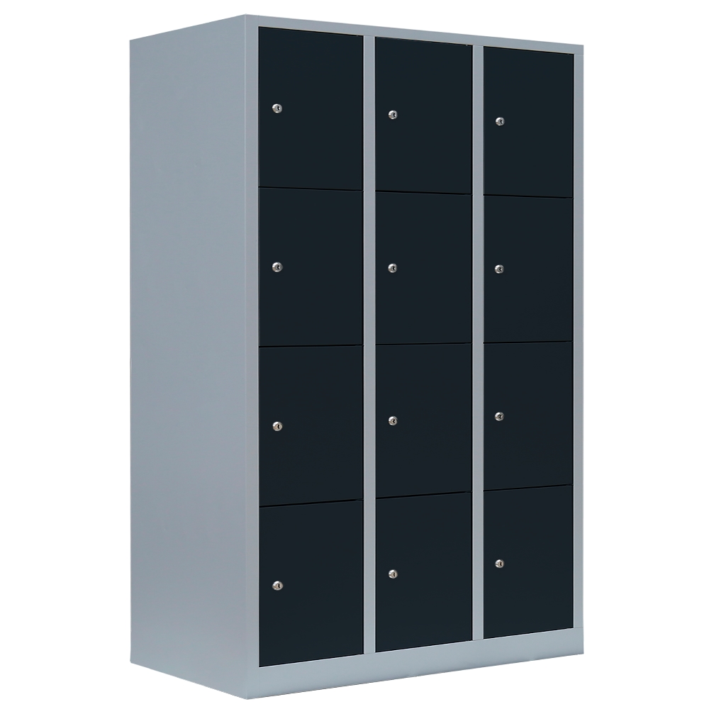 Lüllmann® Schließfachschrank, 3 Abteile, 12 Fächer, 1800 x 1185 x 500 mm, lichtgrau/anthrazit