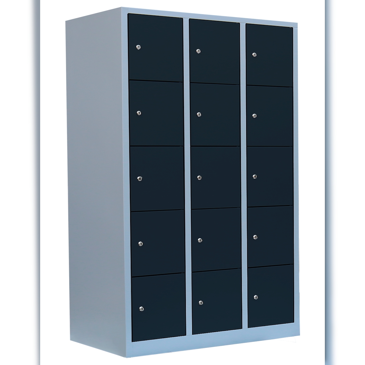 Lüllmann® Schließfachschrank, 3 Abteile, 15 Fächer, 1800 x 1185 x 500 mm, lichtgrau/anthrazit