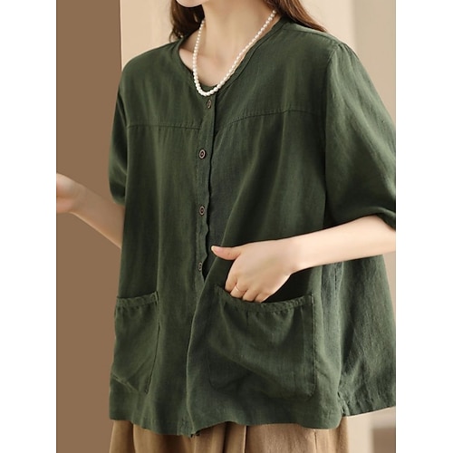 Per donna Blusa Semplice Elegante Casual Mezza Manica Girocollo Top Regolari Quotidiano Tasca Bottoni Nero Bianco Rosa Verde Cachi Estate Primavera