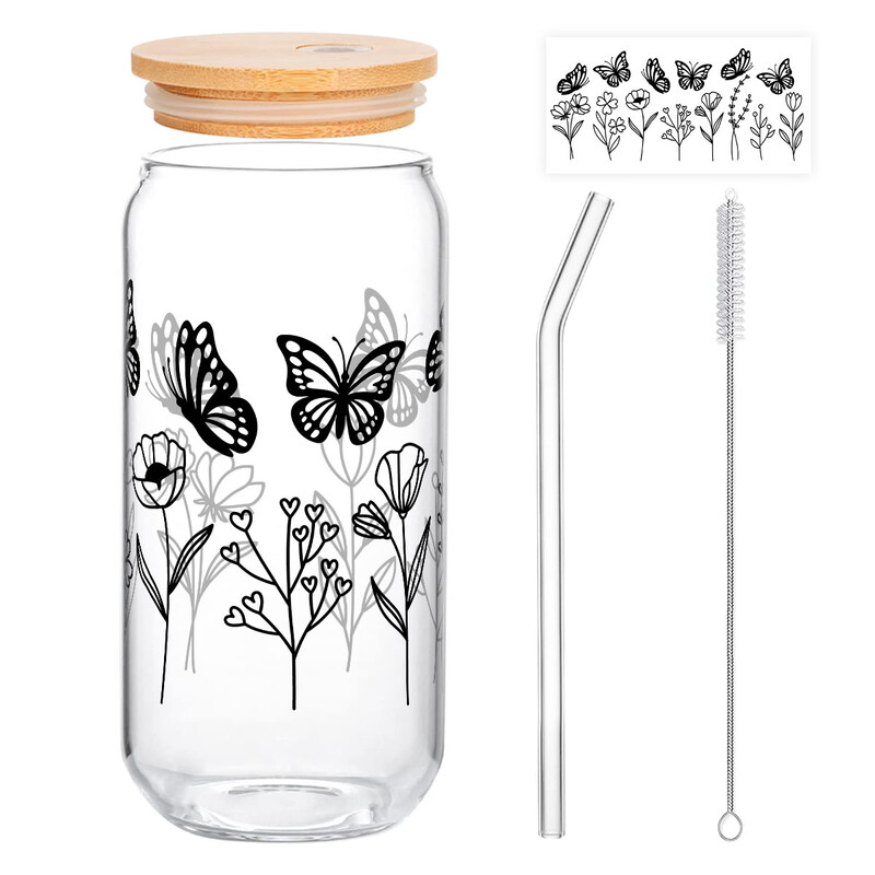 Alphynix Pichet à thé esthétique en verre 500 ml, 1 pièce, avec couvercle en bois et motifs de papillons, bocal de rangement élégant pour thé en vrac, décoration pour comptoir de cuisine