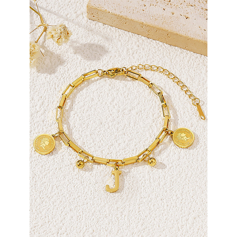Women's Gold-Plated Alphabet Letter Bracelet with Coin and Ball Charms, Adjustable Chain, Stylish Christmas Gift for Her, Personalised Jewelry Accessory