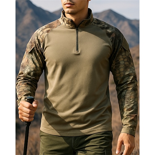 Per uomo Felpa Polo cima dell'escursionismo Manica Lunga Collo alla coreana Top Esterno Traspirante Asciugatura Rapida Leggero Elastico Zip a un quarto Pullover Poliestere Mimetico Verde militare