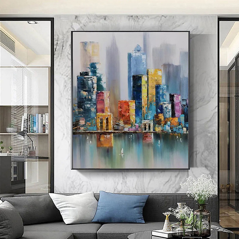 Handmade 3D Cityscape Oil Painting Composition with Vivid Colors and Detailed Brushwork Showcasing Skyscrapers Reflections Water Created with Layered Texture Techniques for Elegant Home Decor