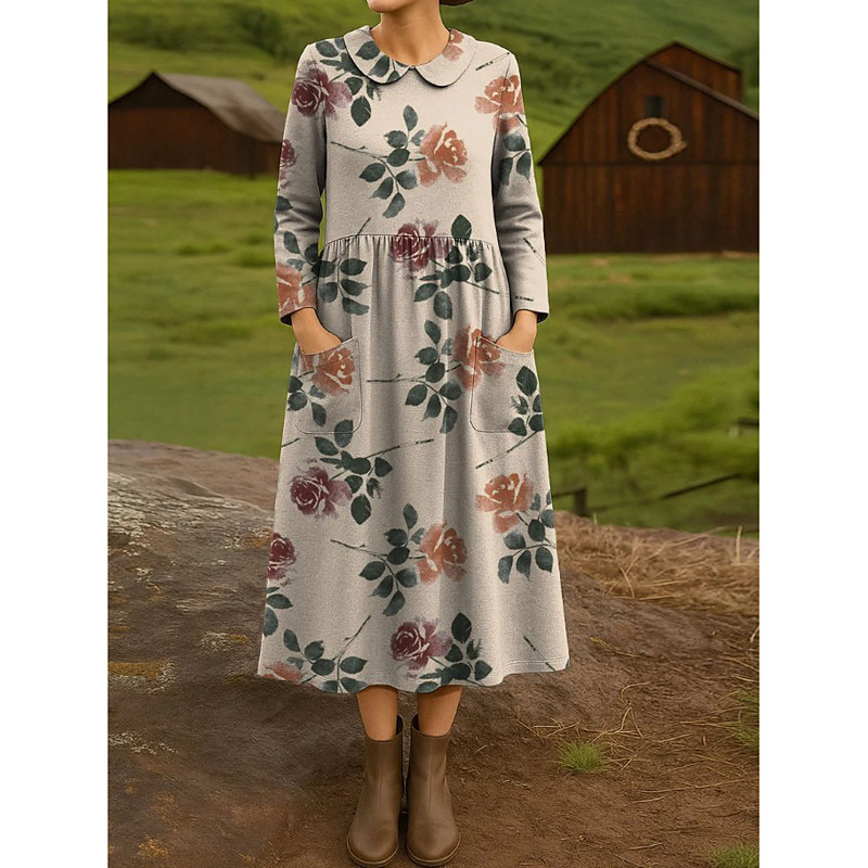 Women's Midi Dress Sheath Dress Pleated Dress Vacation Casual Boho Holiday Spring Dress Regular Fit Floral Graphic Long Sleeve Crew Neck Gray Pink Orange Spring Fall Winter