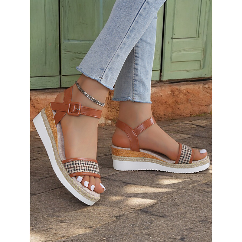Women's Houndstooth Espadrille Wedge Sandals with Ankle Strap – Casual Summer Platform Sandals for Vacation and Daily Wear