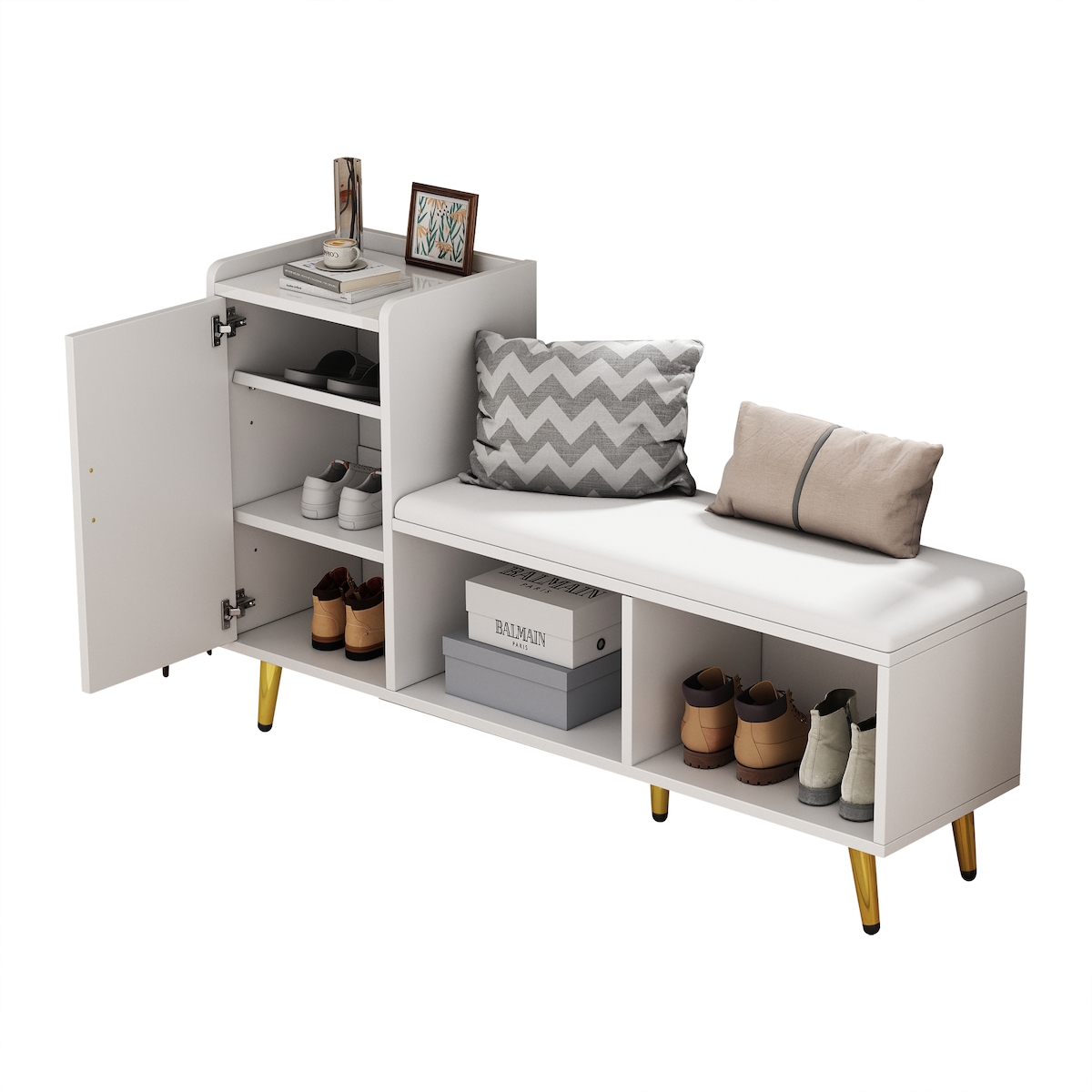OKWISH Schuhschrank mit Sitzbank 120x35x71 cm Hochglanz Weiß PU-Polster 4 Ebenen verstellbar Goldgriffe Stauraum für Eingang