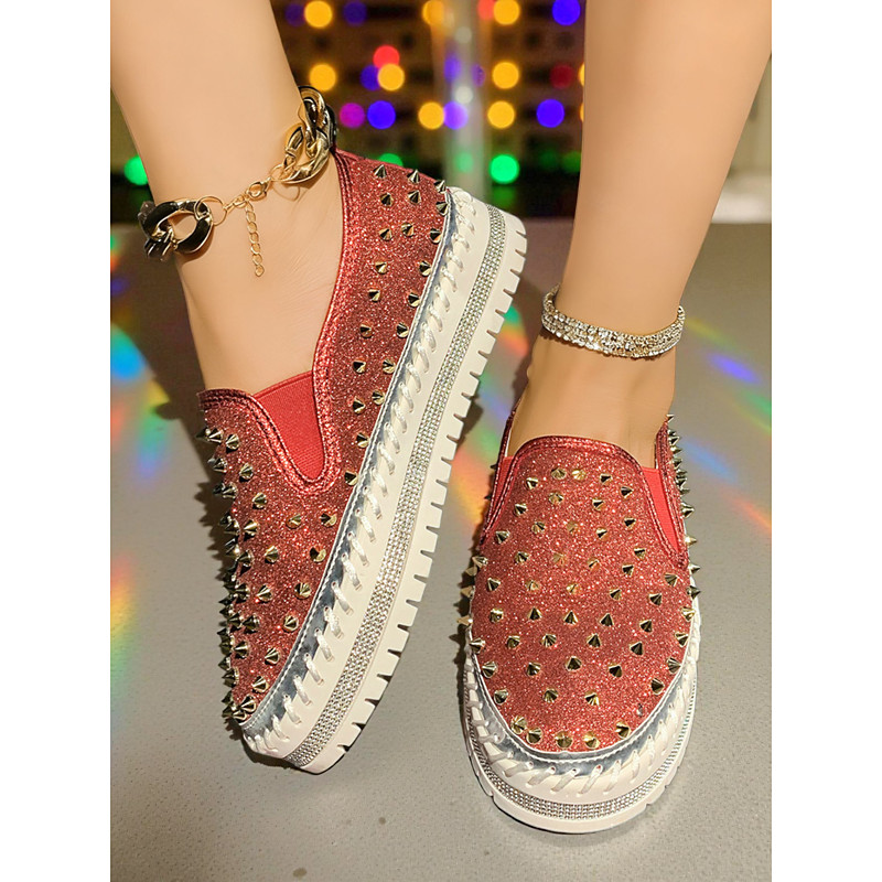 Women's Glitter Studded Slip-On Sneakers - Sparkly Platform Casual Shoes with Rhinestone Trim for Nightlife Party, Clubwear Festive Outfits